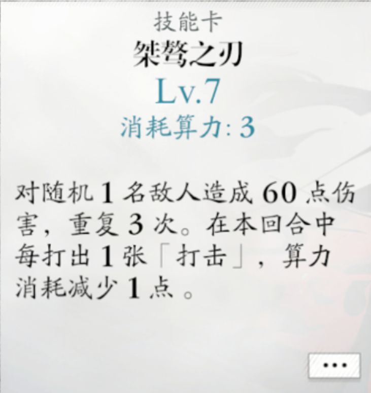 {算力消耗3} 对随机1名敌人造成0.4Atk点伤害,重复3次。在本回合中每打出1张「打击」,算力消耗减少1点。