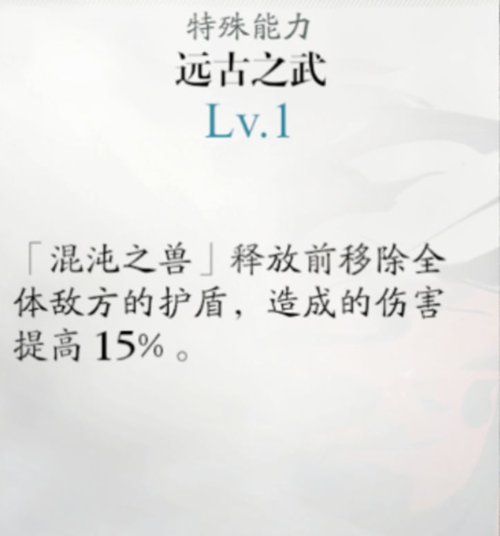「混沌之兽」释放前移除全体敌方的护盾,造成的伤害提高15%。