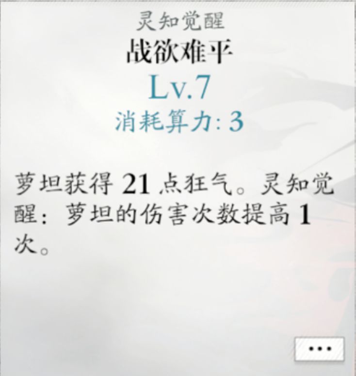 {算力消耗3} 萝坦获得21点狂气。灵知觉醒:萝坦的伤害次数提高1次。