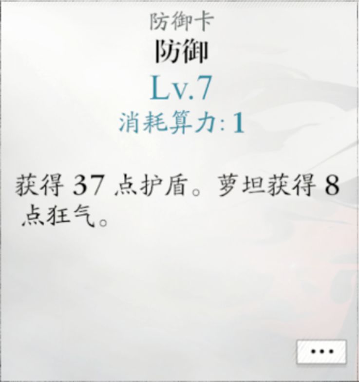 {算力消耗1} 造成0.32Def点护盾。萝坦获得8点狂气。