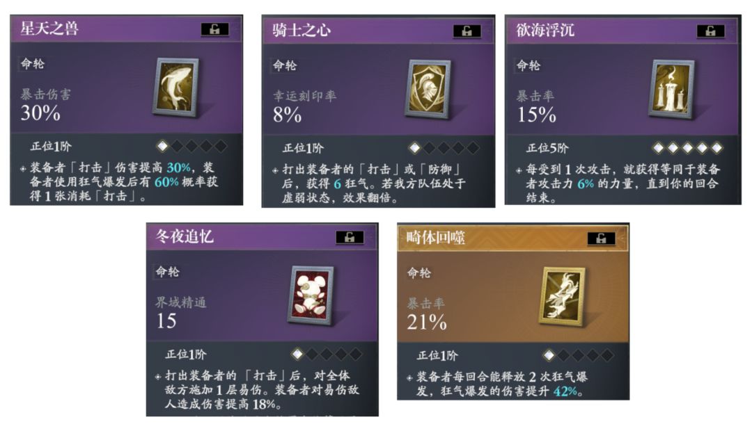 其次是命轮的选择。钦定的命轮「星天之兽」其实并没有那么契合萝坦,因为一方面是放了必杀之后才拿到「打击」总感觉亏了伤害,另一方面则是「打击」是需要消耗1费的,会实实在在的影响队伍的决策。目前笔者的思路是能量回复、力量或易伤、必杀特化。能量回复的代表命轮是「骑士之心」,力量的代表是「欲海沉浮」,易伤的代表是「冬夜追忆」,必杀特化的代表是「畸形回噬」。基于其他考虑而搭配功能性命轮也是合理的。