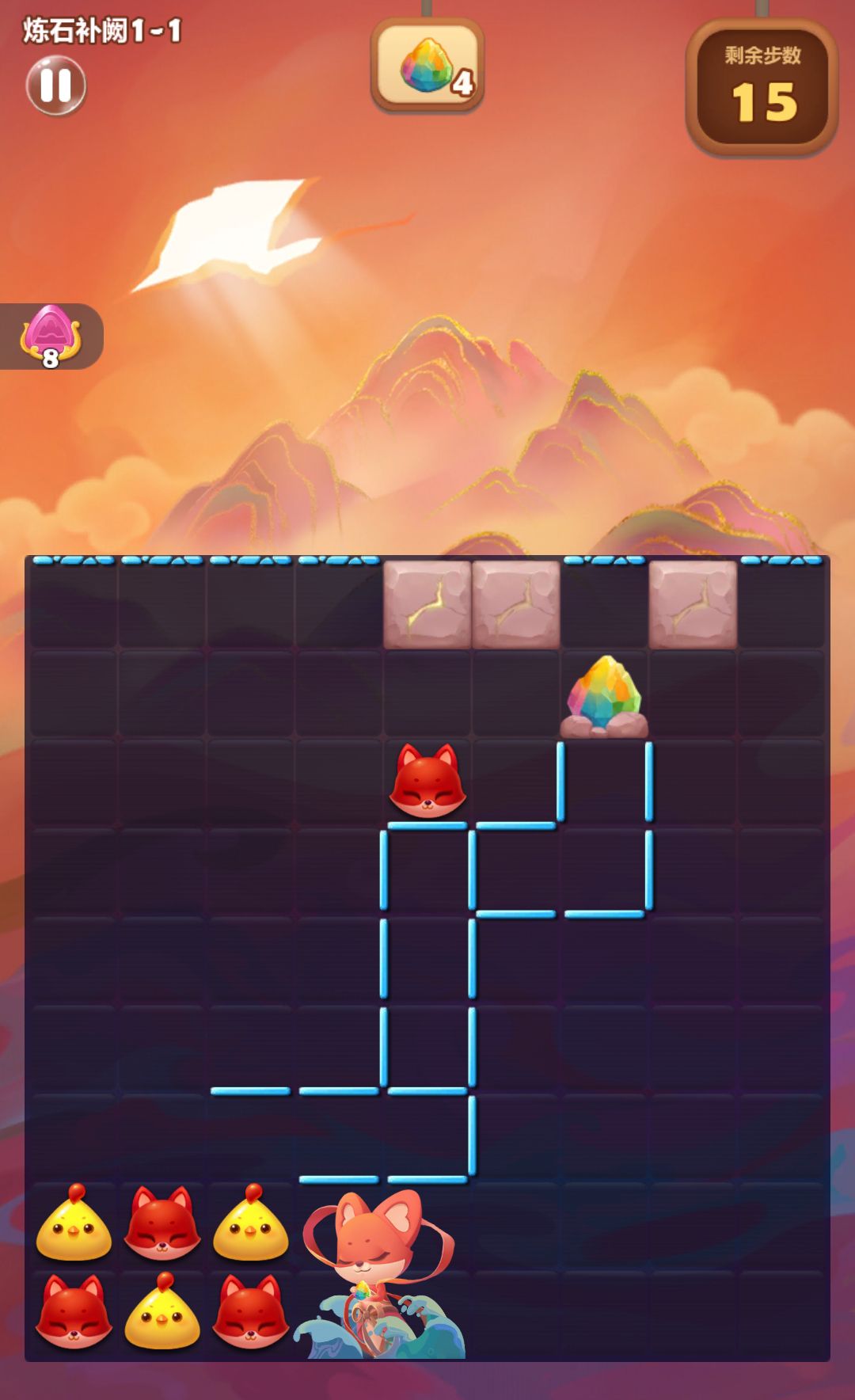 棋盘中的五彩石可通过旁消消除,旁消2次女娲还可使其释放技能,释放大量特效,当关卡内所有五彩石被收集视为闯关成功。