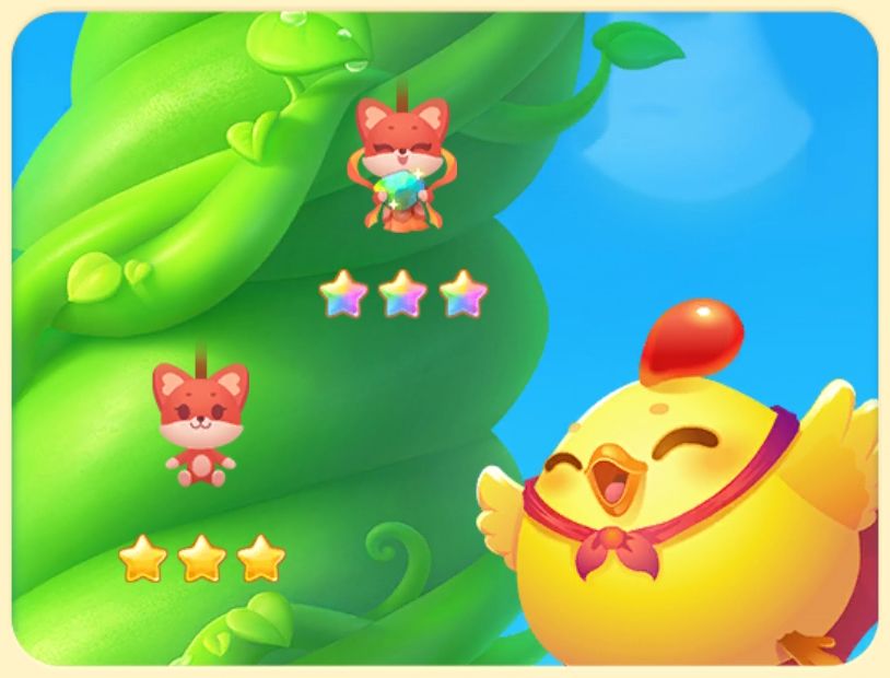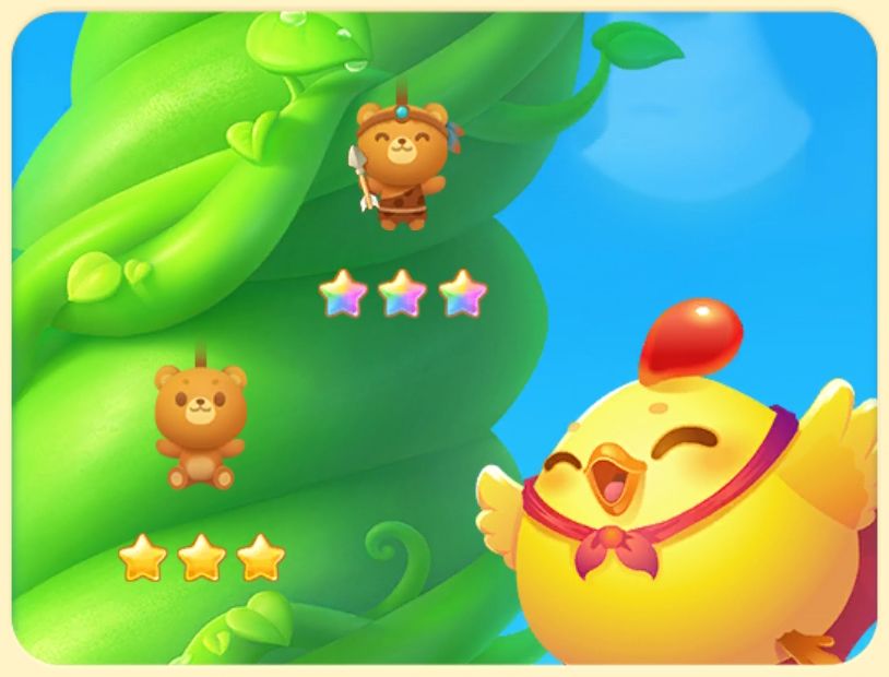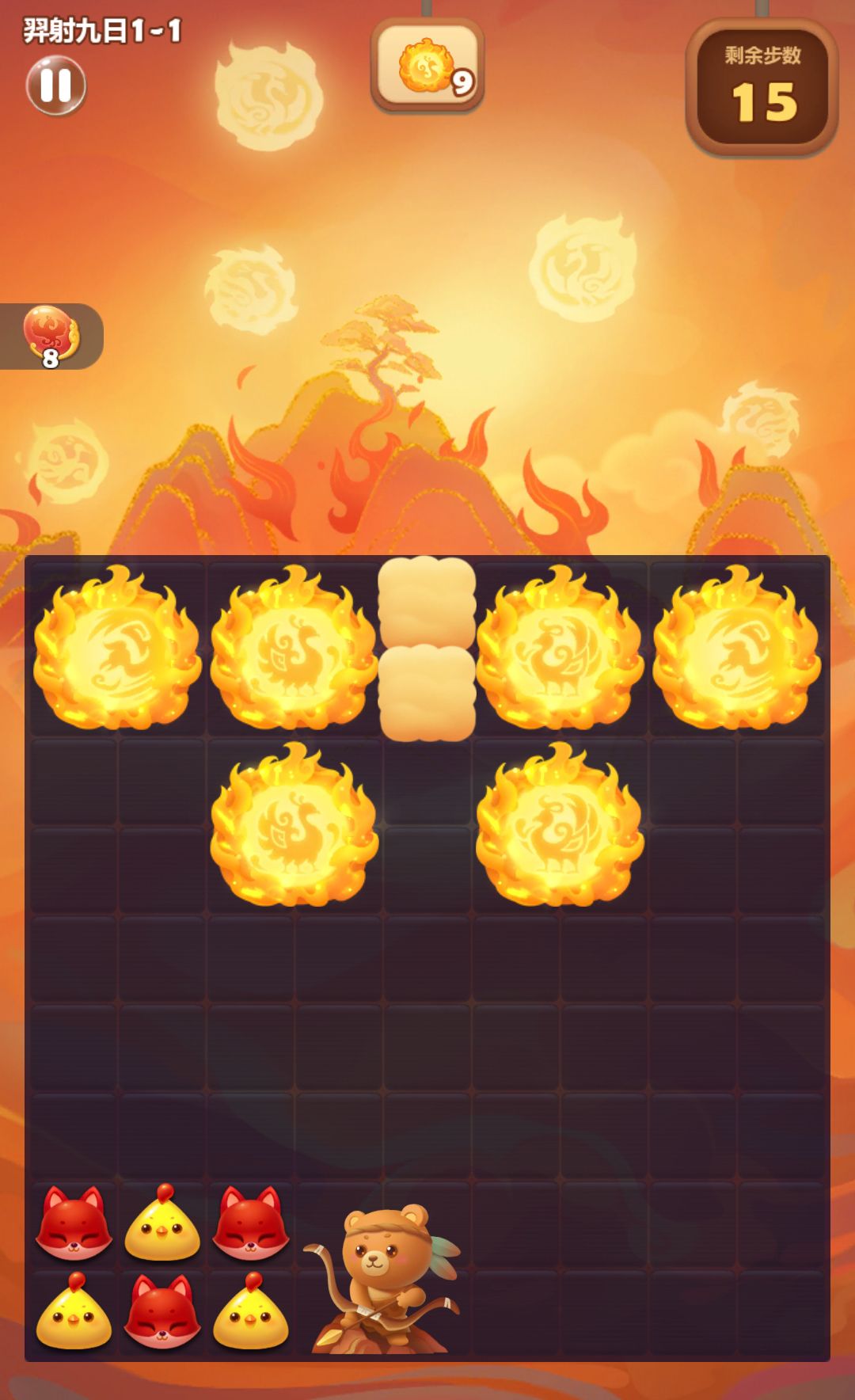 棋盘中的金乌与云彩可通过旁消消除,旁消2次后羿还可使其释放大招,消除棋盘内两行全部的障碍,当关卡内所有金乌被消灭时视为闯关成功。