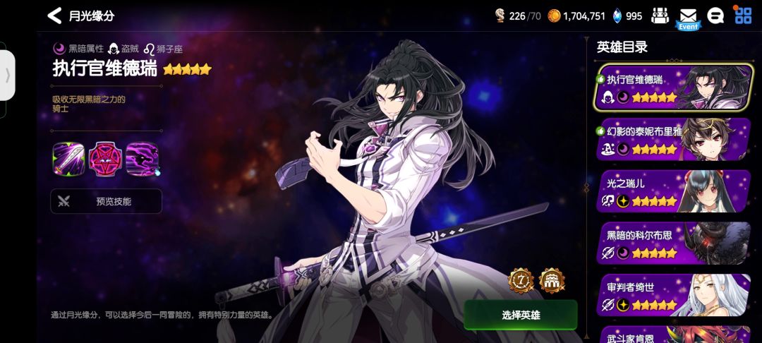 完成日常周常任务,每天可招募一次,招募20次之后可任选一个领取,也可继续招募,新手不着急。推荐选择支配者莉莉亚斯,协调者卡威利,末日罗非或与自己阵容搭配的角色。一般是玩几个月出了一些光暗角色之后再选,避免重复。