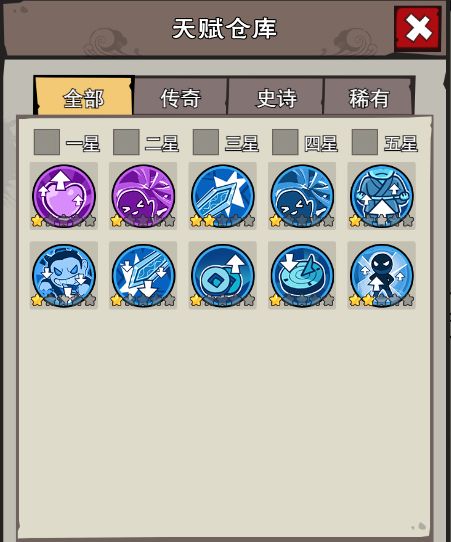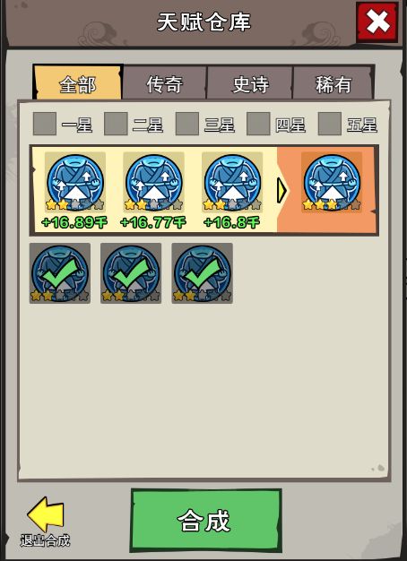 6、 3个同类型、同品质、同星级的天赋可以合成为1个同类型、同品质、星级+1的天赋。5星天赋无法再互相合成。一键合成天赋只会将未装备在英雄身上的天赋作为材料。