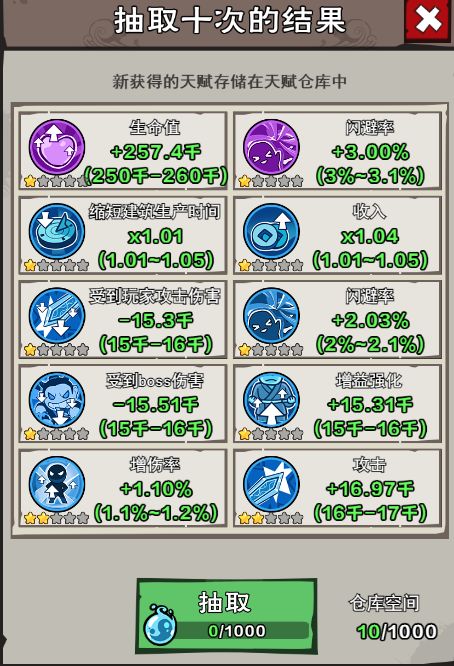 3、可以通过抽取功能来获得天赋,抽取天赋消耗天赋点,获得的天赋点自动存储在天赋仓库中,所有英雄个公用一个天赋仓库,天赋仓库最多可以存储1000个天赋。