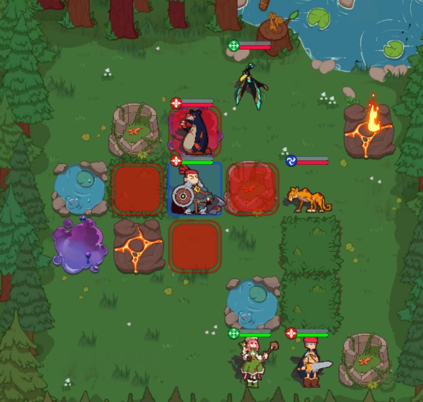 如图所示,两个敌方被我方引到了污水中,而我方3个勇者都站在有利地形中。合理的利用地形真的太关键、太重要了,这点新手一定要尤为注意!