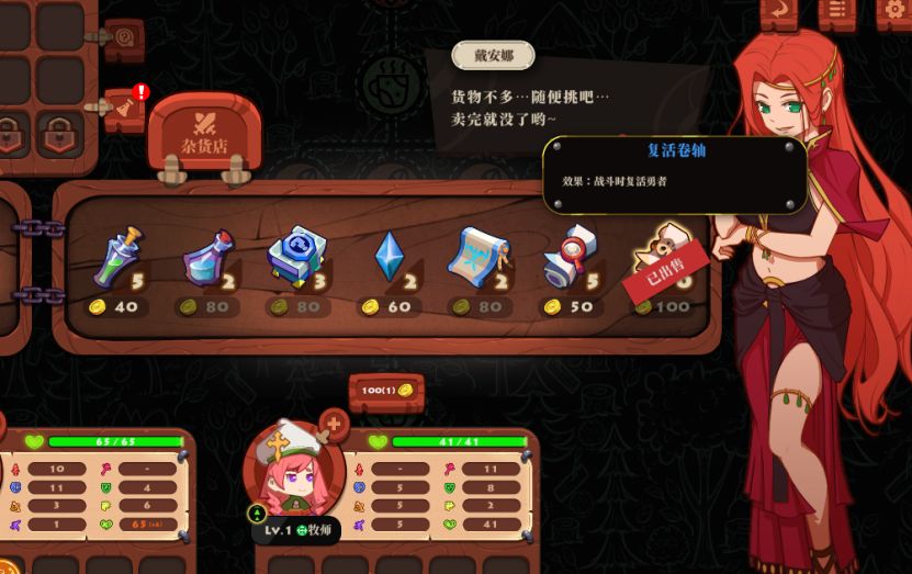 商店中,一定要先买一个复活卷轴,其次再根据实际情况买别的,复活卷轴在最后的BOSS战中基本都会用得到,其他战斗就尽量别用。