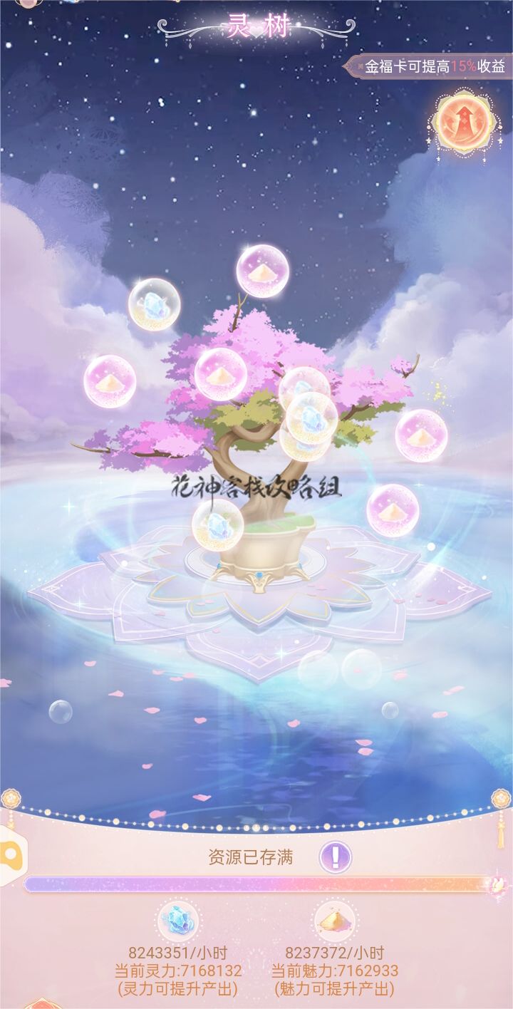 灵树是首要收集资源的途径,每5分钟可以收取一次。购买金福卡可以提升收益。