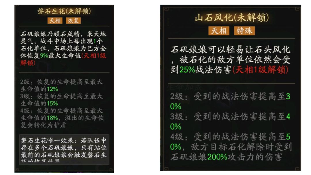 【山石风化】让石矶娘娘能与更多以战法为主要输出手段的伙伴并肩作战,使得配队更加灵活,被石化单位受到战法伤害增加的效果对友军不生效。