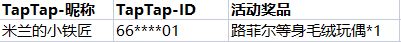 恭喜以上1位队长获得【路菲尔等身毛绒玩偶*1】请您务必在平台填写获奖收货信息,或在3个工作日内加入官方QQ群,请联系管理员@草莓 或 @诗夙 提交社区ID、个人信息截图,以及中奖通知截图,我们会在核实获奖者身份后,为队长提供相应兑换!再次感谢大家参与本次活动!