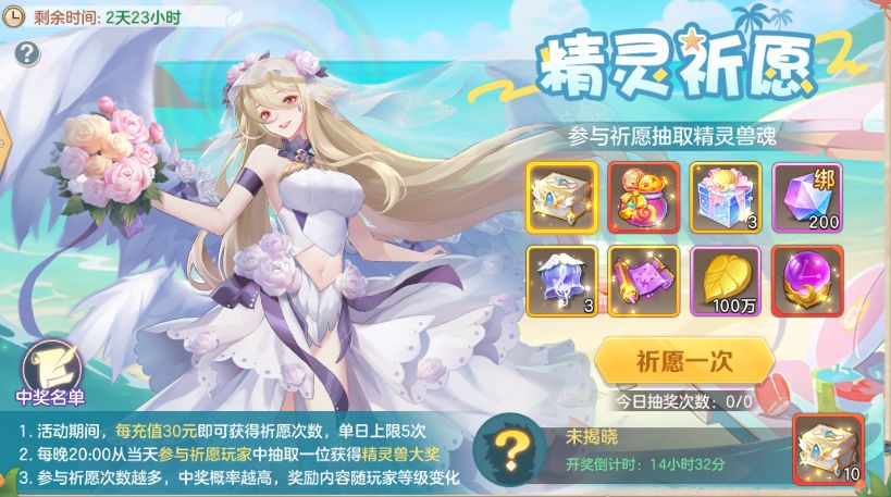 ✦每晚20:00从当天参与祈愿的玩家中抽取一位获得精灵兽大奖;