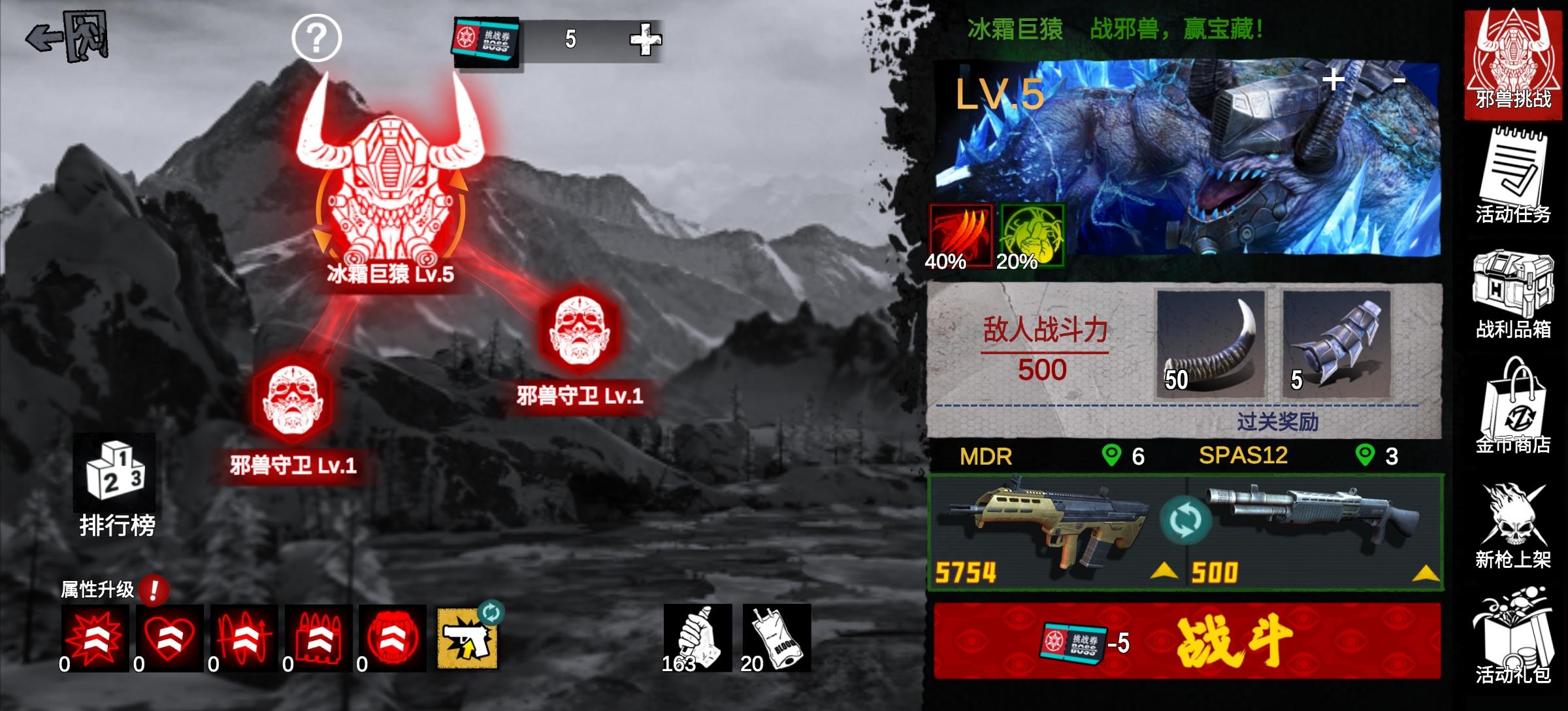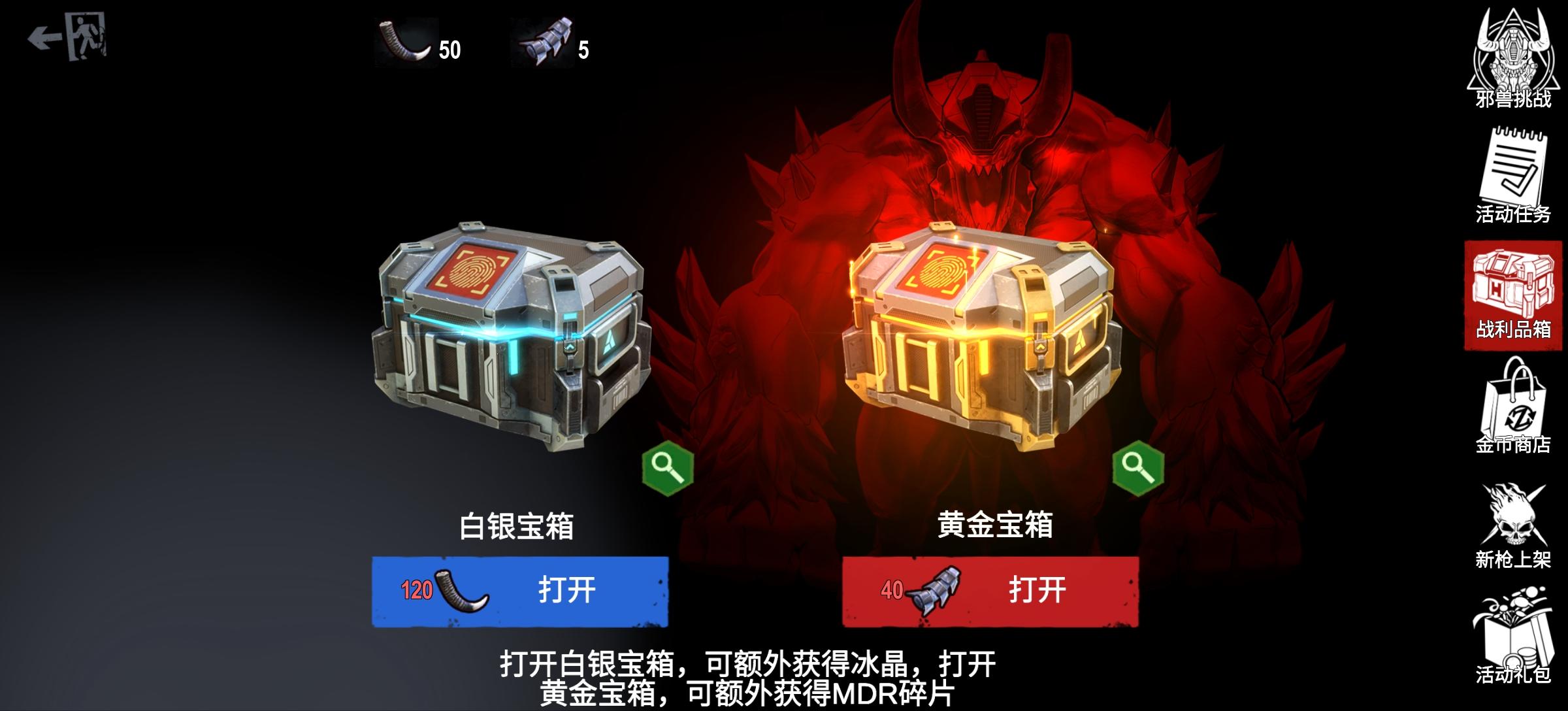 5、玩法中获得的巨猿犄角和巨猿尾刺可用于开启对应宝箱,获得各色道具奖励,同时得到的冰晶可自由选择强化属性,获得MDR碎片可用于兑换武器MDR。强化属性只针对本期活动玩法有效,活动结束则消失。