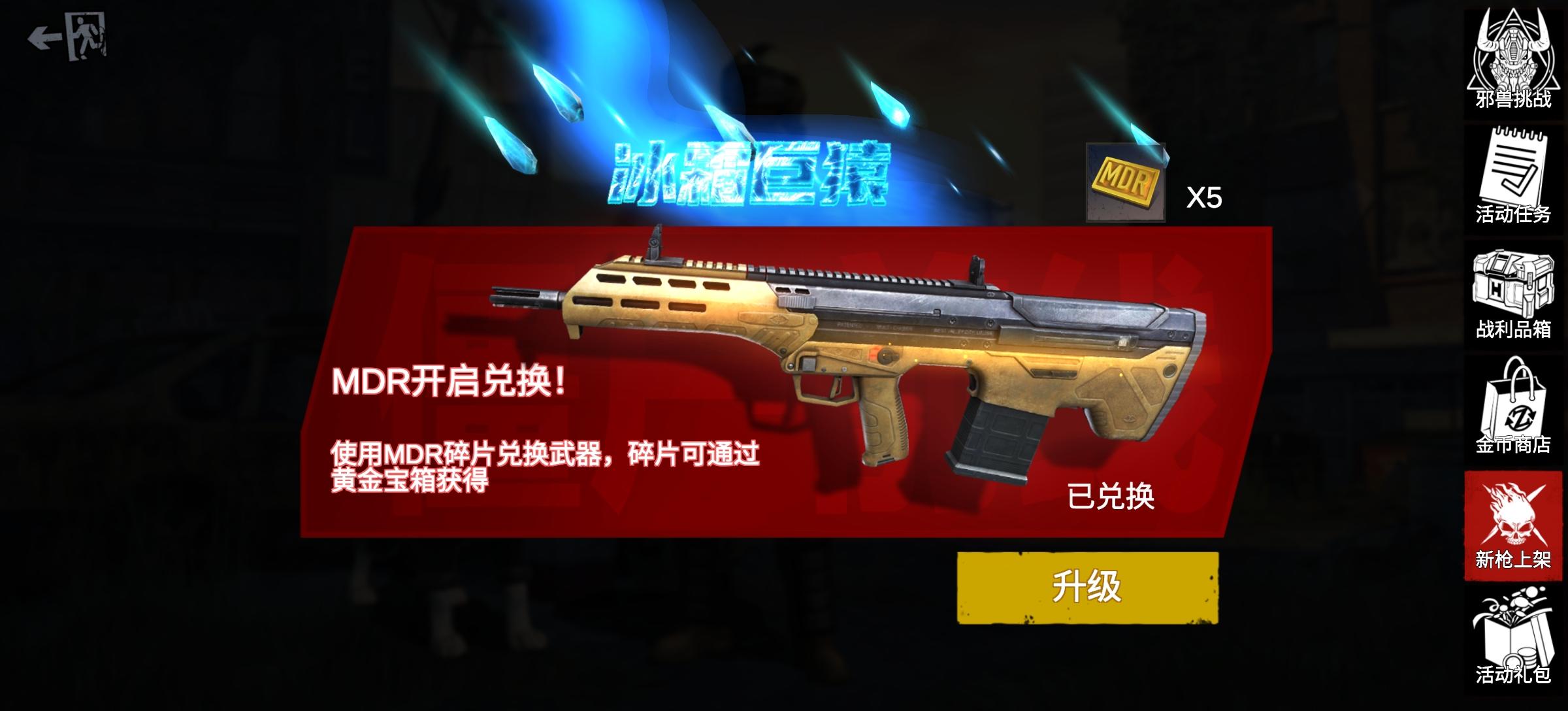 强力武器MDR再次开放限时兑换。其中MDR碎片可通过“冰霜巨猿”BOSS任务奖励获得,以及开启BOSS黄金宝箱获得。同时,MDR碎片将开启专属兑换活动,可将多余碎片兑换成龙枪、火焰枪等特殊活动武器碎片。