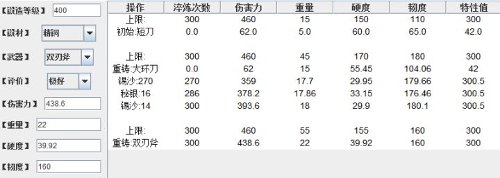 下面以精铜加速双刃斧为例计算需要的材料数量,前270次锡沙,需要50*1+50*1.18+100*1.33+70*2.5≈417个锡沙。然后16次秘银、14次锡沙。所以总共需要16*2.5≈40个秘银,417+14*2.5≈452个锡沙。