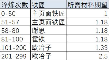 通过计算可以得出第1-50次淬炼成功,平均每次需要1个材料。第51-100次淬炼成功,平均每次需要1.18个材料。第101-200次淬炼成功,平均每次需要1.33个材料(欧冶子)。第201-300次淬炼成功,平均每次需要2.5个材料(欧冶子)。
