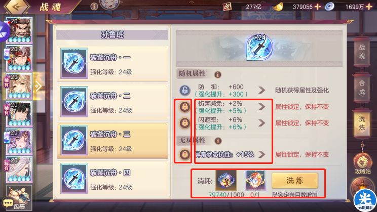 对于属性不满意的战魂,可以消耗魂玉和无双战魂石来洗练,这里是可以锁属性的,一定要锁住满意的属性,再洗练。如下图: