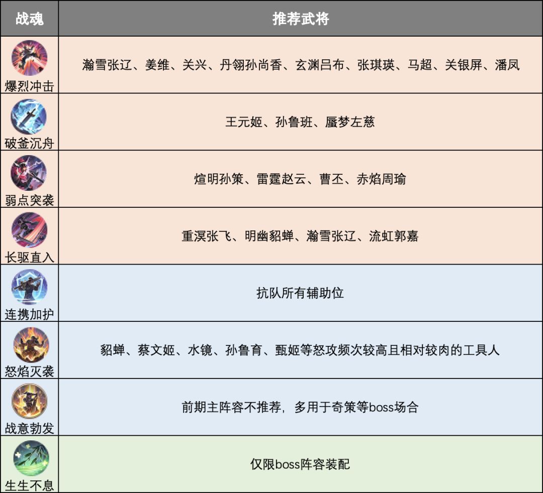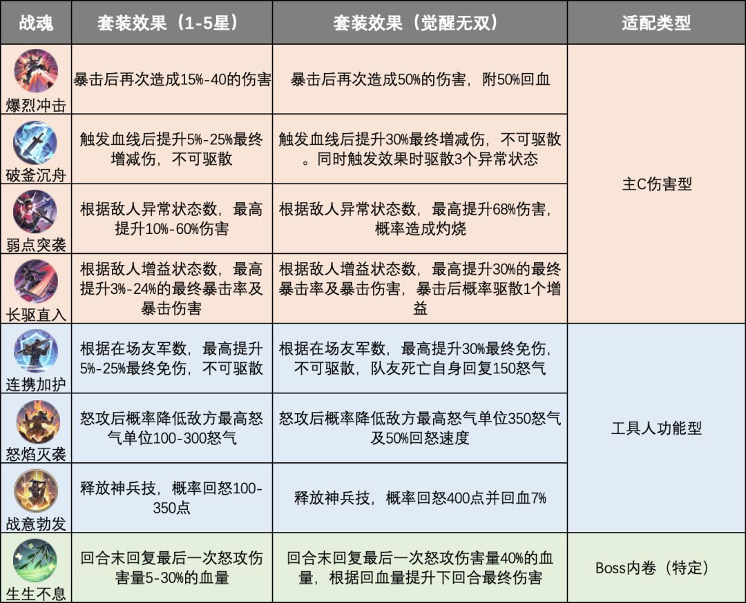 为了方便新手玩家理解,下表为各个战魂的套装技能效果提炼介绍: