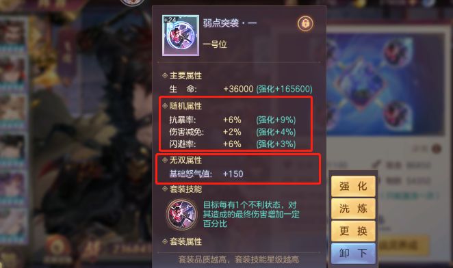 显然,随机属性3百分比的战魂,是理论上5星战魂觉醒的最佳选择,但是实际情况中由于无双属性也是随机的,后期多数情况下还要再洗练,所以,通常2百分比的战魂,前期就可以觉醒了(其中主C优选暴击、增伤,辅助优选免伤)。另外,+1到+24升级过程出现的强化随机属性部分,由于挑选的成本太高,不建议各位玩家强求。