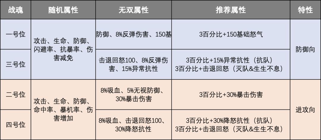 每个战魂均有3个随机词条,觉醒后会出现无双属性,具体如下: