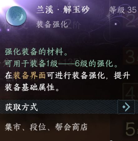 装备在强化的时候会消耗大量的【兰溪·解玉砂】这个是比较重要的材料,可以在集市、段位奖励或者帮会商店内购买到,材料还是比较好获取的。