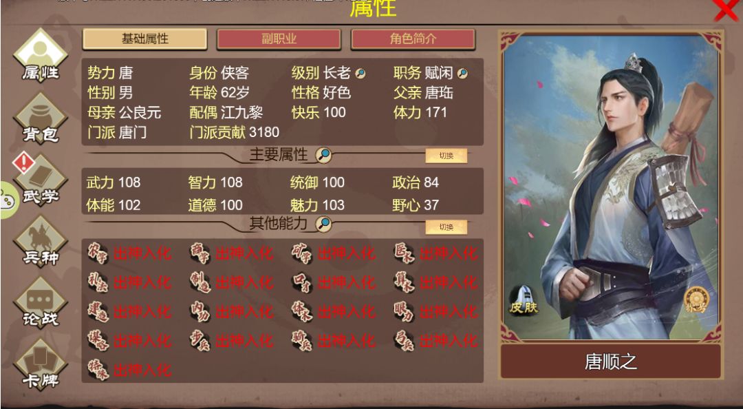 武学:人物的武力界面,可在其修炼武学,,搭配武学,专精,解锁经脉等。