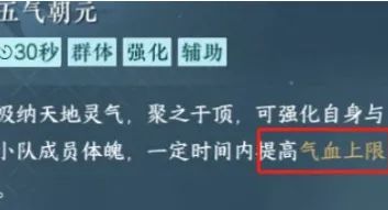 五气朝元可以提高血量上限,有奶妈的时候带一下,开局就开开来,冲进去,可以强化一下队友,换生决有一个大盾,很有用