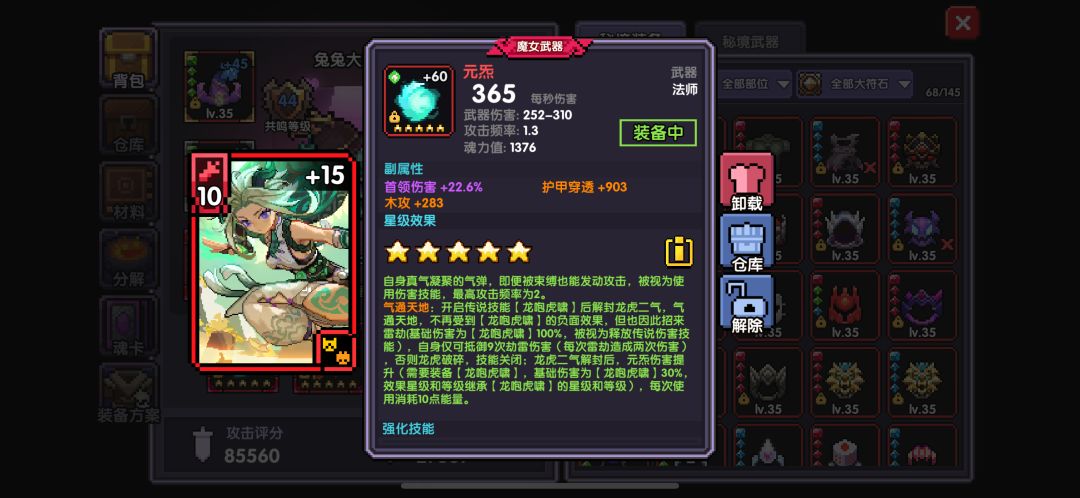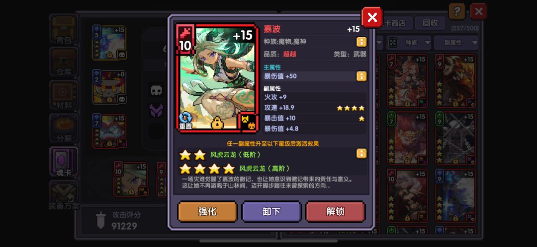 宠物羁绊 + 15,星盘 I 环风 + 10,还差 25 点,可以从魂卡副属性、游侠魂珠里面补,例如主属性是爆伤,副属性是 4 星攻速的魂卡: