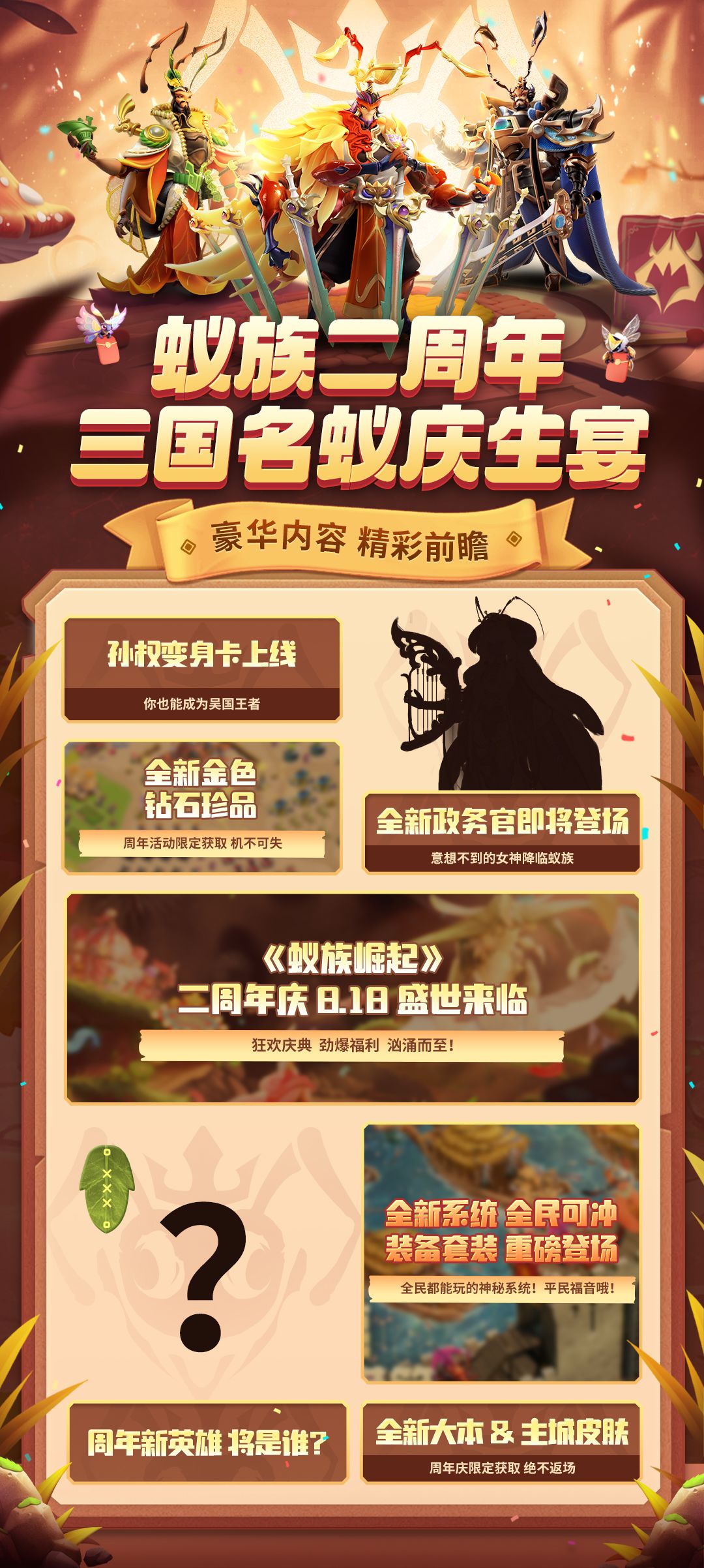 大家好,我是小娅!时光飞逝,转眼间《蚁族崛起》已经快陪伴大家两年的时间!而我们的蚁族二周年盛典,也将于下个月,8月18日如期而至!所以由今日开始,小娅会在本公众号正式开启“周年庆月”!海量的周年庆爆料和福利,将会在每篇推文中为你一一送上!而今日率先给大家的,便是本次蚁族二周年庆的所有内容前瞻预告一览图!让各位统帅一目了然!