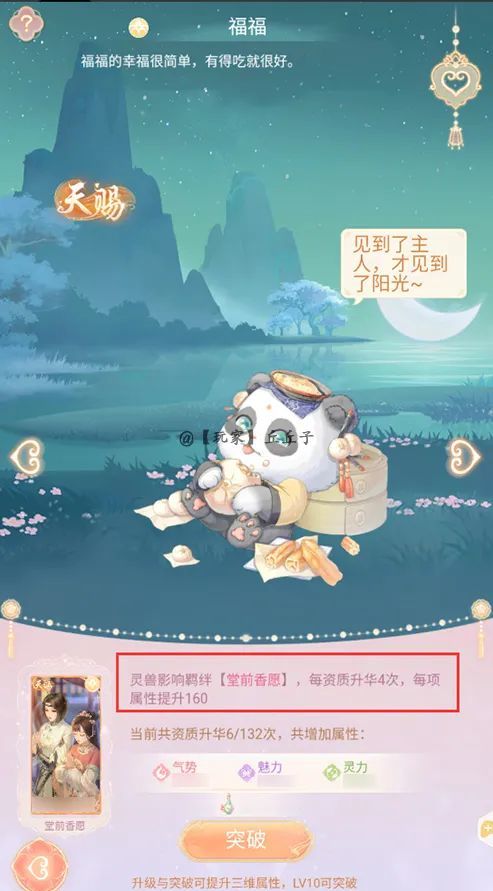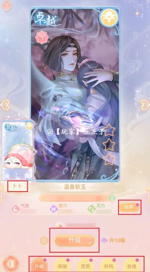升级可以同步提升羁绊的气势、魅力与灵力;培养则是通过不同的丹药专注提高其中一项能力的上限。