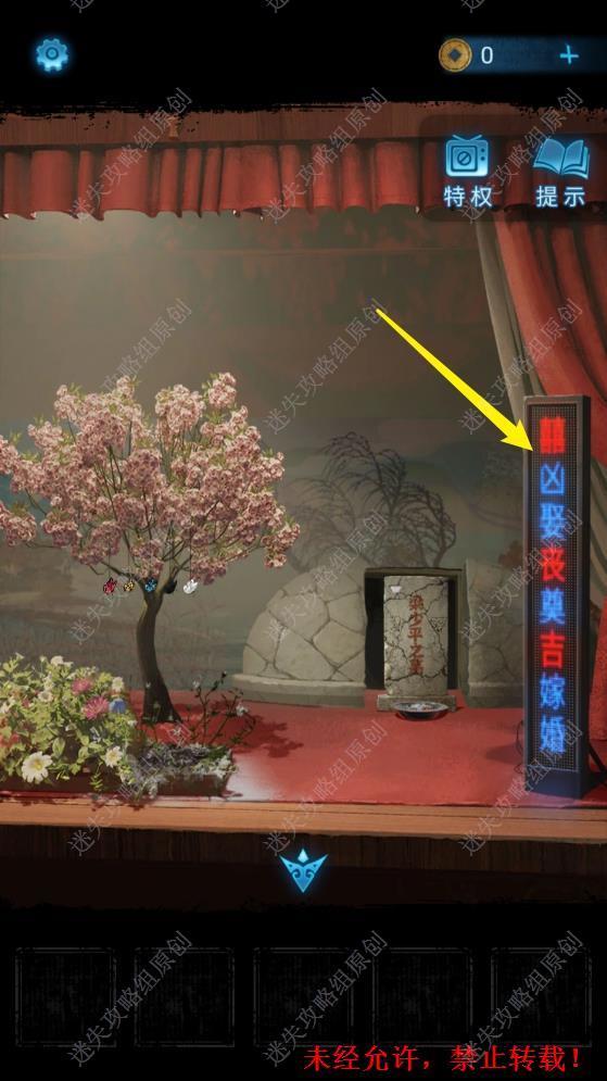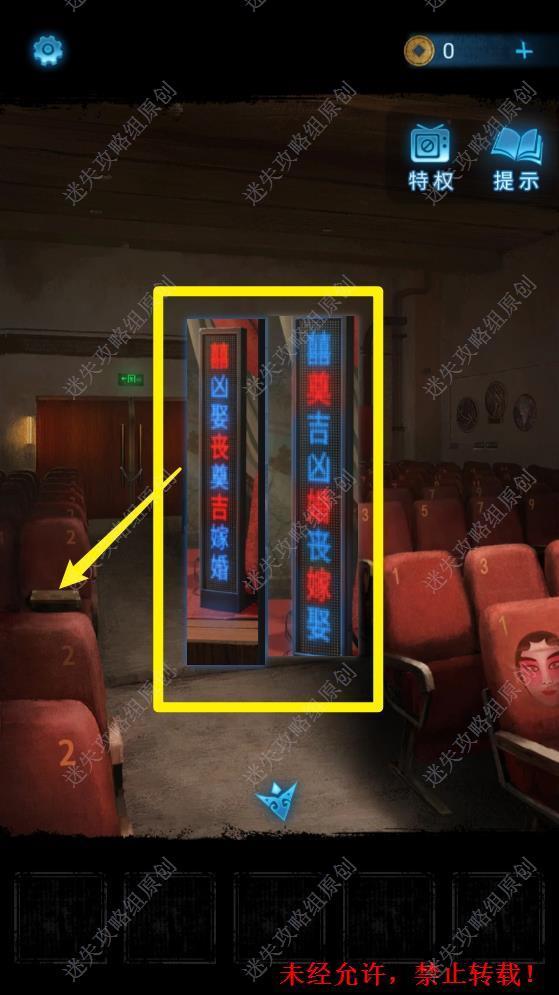8.返回上一个房间,可以看到墓碑前的LED屏打开了,观察LED屏上的字体。根据屏上的红色字体顺序打开观众席左边座位上的盒子。注意顺序从上到下为奠-丧-婚-吉-嫁。这里给出第一步的操作方法,后面的操作就是很简单的。打开盒子后得到化妆笔。8 8.1 8.2