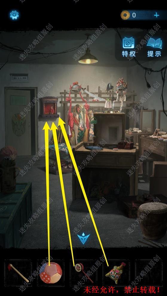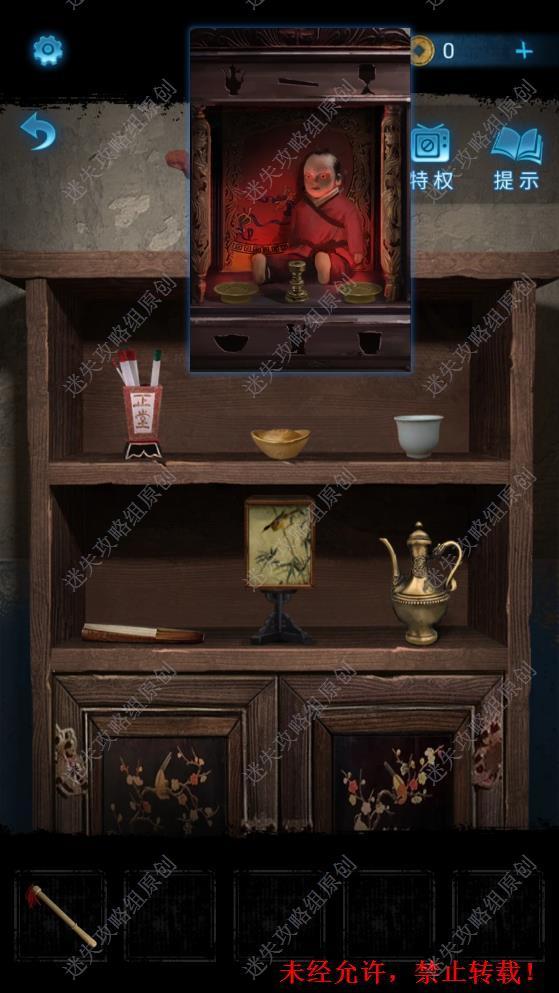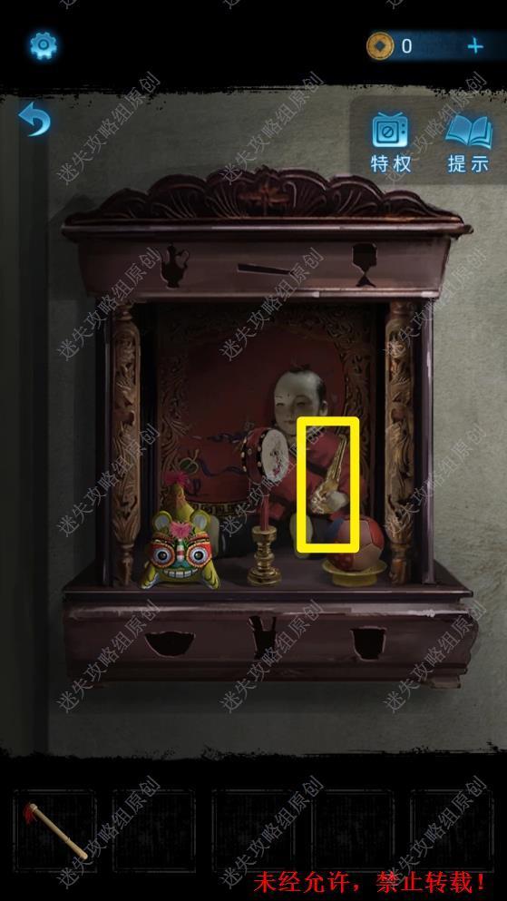 18.返回前屋,将布球、拨浪鼓、布老虎放在神龛中的布娃娃面前,得到钥匙。18