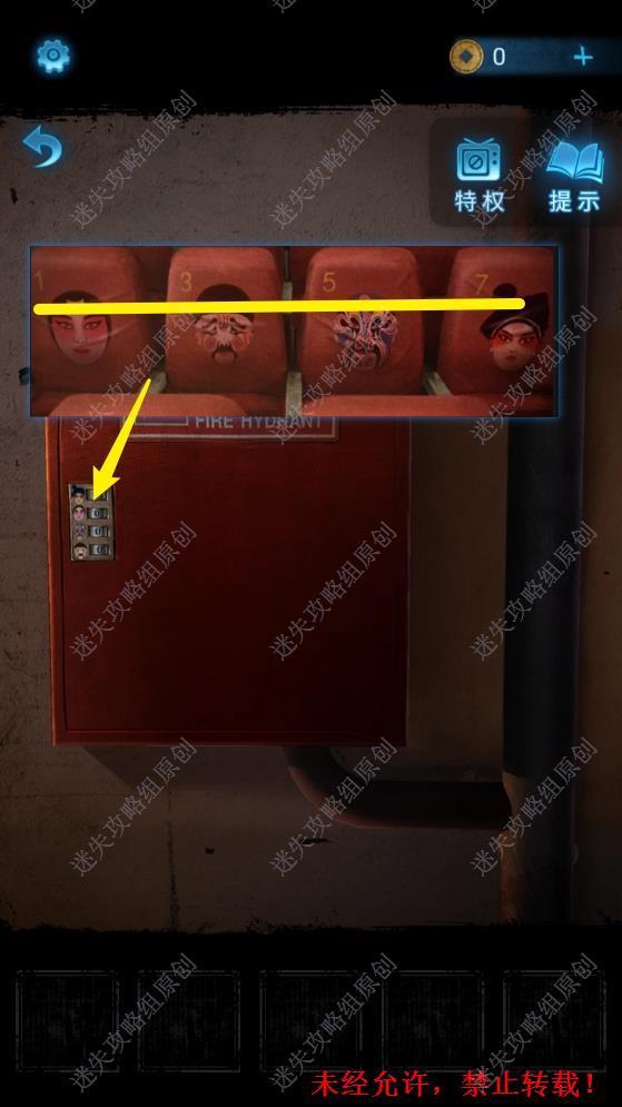 1.点击右侧画有脸谱的座位,得到脸谱排列信息后,按照此信息将右后方的消防格打开,得到灭火器。1 1.1