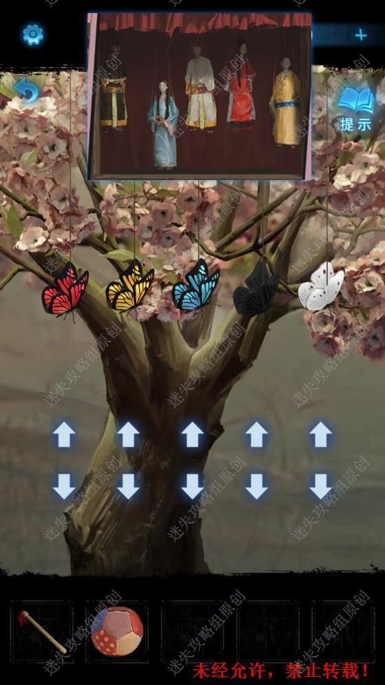 15.点击右边的小戏台,从手机中看到五个不同颜色高低的人偶。回到戏台场景,点击戏台树上挂着的五个蝴蝶。15 15.1