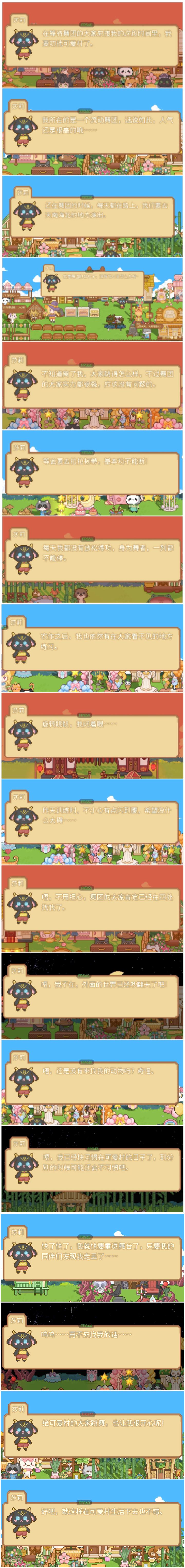 将羊羊所有的话都整理了,并按自己的逻辑进行了一些排序。合理猜想莎莉应为舞团嫉妒者在其睡觉时将她从车里扔下(坏蛋!)甚至没有考虑过在陌生环境中她将如何生存。可怜的莎莉却从来没有起疑并只觉得大家跳舞都很棒,一度认为会有人来找她,又在苦等中一遍遍地否定自己(好心疼啊)。最后,只是庆幸她被丢到了可爱村……