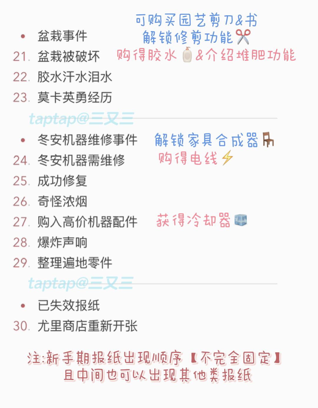指在游戏最初或更新后优先出现,用来解锁地图与各种新功能的报纸。个人统计有29篇。注意,报纸出现顺序并不是固定的!!而且这中间也可以插进来其他非新手期报纸。如果刚玩的你陆续把以上报纸都解锁了的话,蘑菇村的方方面面便已经了解了大半,恭喜你可以悠闲养老(?)啦🎉