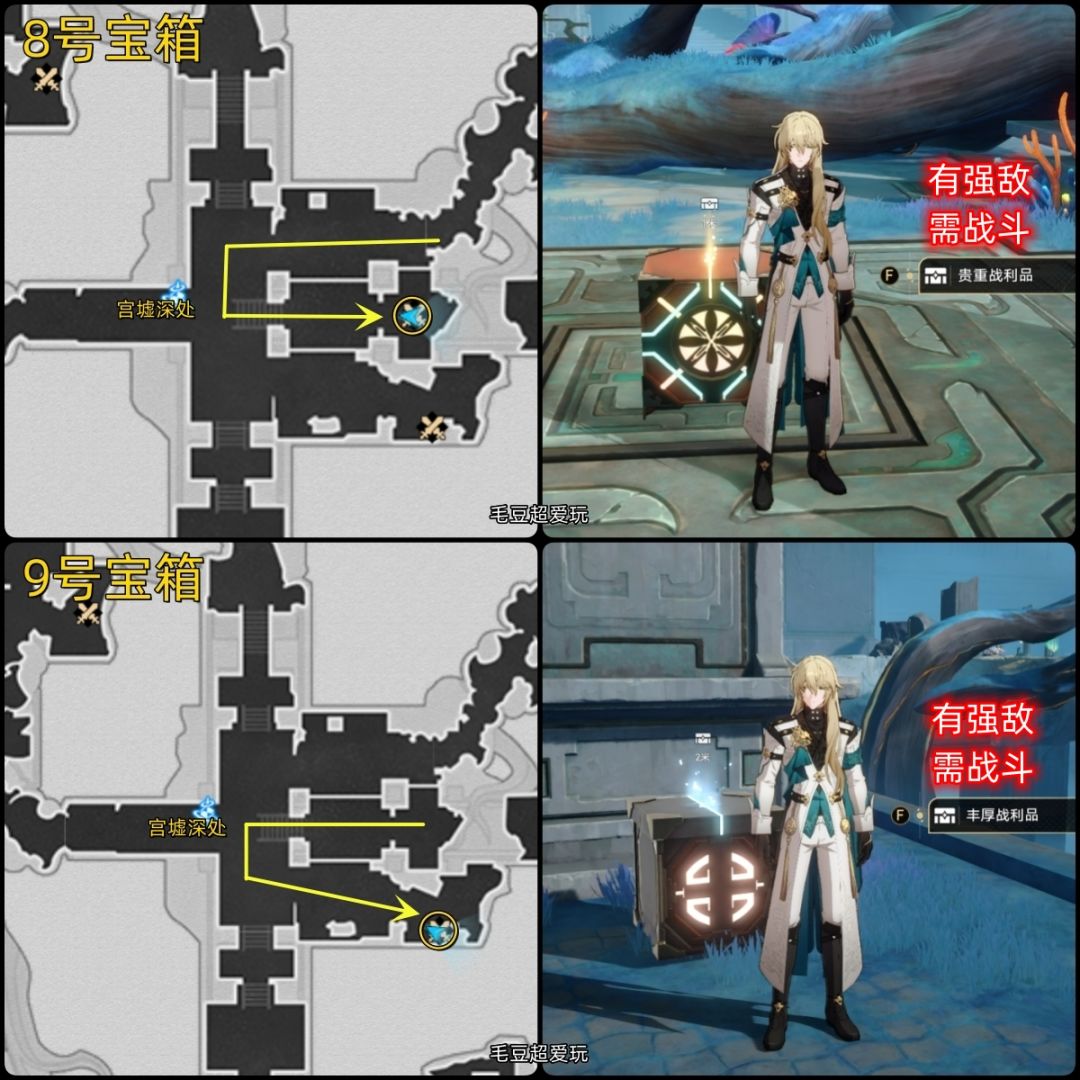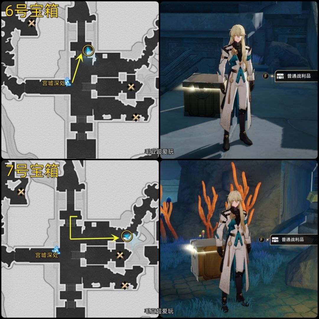 6-7号宝箱:接着传送至「宫墟深处」,朝地图右上角前进一小段距离,下楼梯右转就能看见6号宝箱。原路返回,上楼梯左转,7号宝箱的位置很显眼。