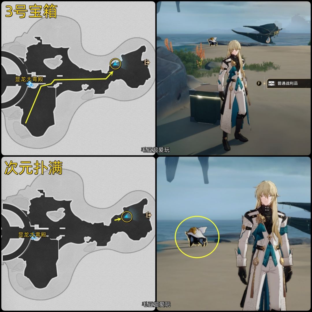 3号宝箱、次元扑满:顺着地图右侧一直走,宝箱和次元扑满挨得特别近,扑满在海滩边的星槎旁。如果扑满逃走,可以利用“传送至其他地图”刷新,再次传送回来就能看见它了。