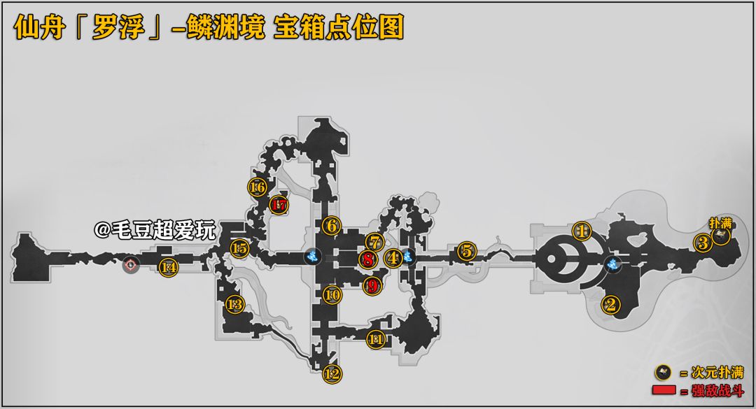 害怕迷路的开拓者可以跟着毛豆图中标记的路线走,下图为「鳞渊境」宝箱点位图,各位开拓者也可以根据此图查漏补缺。