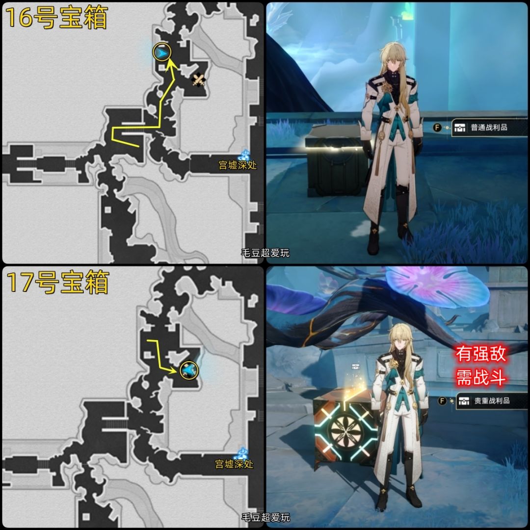 16-17号宝箱:按照下图路线前进,16号宝箱直接拿,17号宝箱有强敌把手,新怪物的锁血还是挺麻烦的,建议有罗刹的带上罗刹,解控很好用。