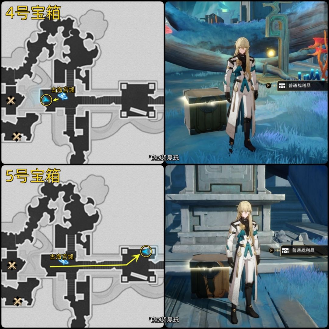 4-5号宝箱:传送至「古海宫墟」,未开启传送点的旅行者优先过主线!传送点地图左侧是4号宝箱,5号宝箱在传送点地图右侧的平台上。