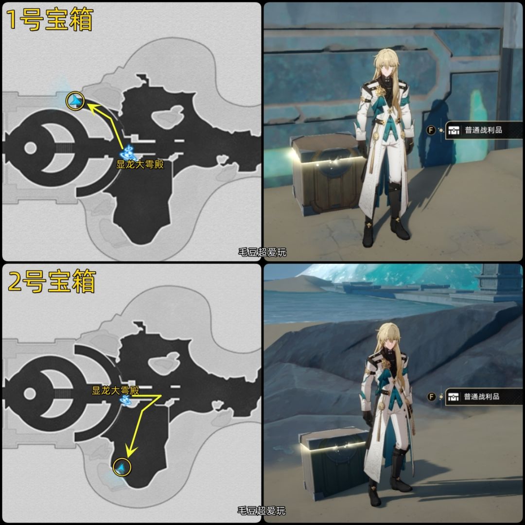 1-2号宝箱:首先传送至「显龙大雩殿」,地图左上角圆盘的尽头处是第一个宝箱。第二个宝箱的位置比较刁钻,容易漏掉,开拓者注意查看地图能通过的小路,从小路进入沙滩拿到宝箱。