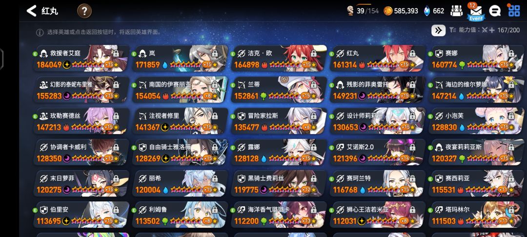 更新下玩了半年练度,玩了五六个月后已经开始正式养老了,主线全通,挑战深渊全满星,迷宫也是全通,没有活动就是每天登上去趁着每日活跃的金币buff,把体力买了刷刷讨伐,每天打打团boss和团战,每月清清塔和循环迷宫还有支线故事。刷了半年up的讨伐和未纪事后,我现在是既不缺装备也不缺催化剂,对于零氪玩家来说,拉了一堆角色后,萝卜就会非常稀缺,真要慎重用,像是偶像一技能这种完全没必要点,因为10好感会给三个爱心,相当于专属萝卜,其实偶像只要点到三技能满,二技能差三个萝卜点满这种,等满好感把二三技能点满就行了,包括木飞一技能那些,虽然点高了有概率提升,但是如果你没有把她用来打PVP的打算的话,也是完全不用点的。像我现在一堆角色光夏、疯龙、暗小泡芙、火飞、萌王这些装备都差不多毕业了,就是技能点不起,PVP都不好拿出手。现在属于是抽卡没有提升,刷龙提升很小,只有慢慢等萝卜,才能很好的提升战力,大部分能拿萝卜的地方都尽量去拿了,包括循环迷宫换了三个穿透项链后就开始赌两代币的箱子,包括奸商胡奇的箱子,还有团boss结算,都有可能出萝卜,远征只要不是木暗一起来,通行证都会买,除了银河硬币的萝卜舍不得买,其他能买的都会买。除了缺萝卜,还缺重铸材料,即使远征打满,活动送了一堆重铸材料箱子,宠物也是重铸材料技能,还是缺,我现在是勉强把主c的装备都重铸了,辅助的肉装速度装,大部分都还是85或者88。