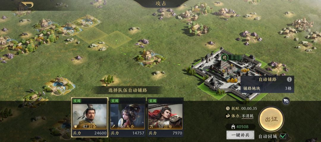 同时,我们还搭配了自动连地功能,主公只需要选中自己要打的资源地攻占即可,系统会自动选择体力消耗最少的路线铺路过去,不需要另外用铺路队去手动一格一格的铺,一队主力即可畅玩。
