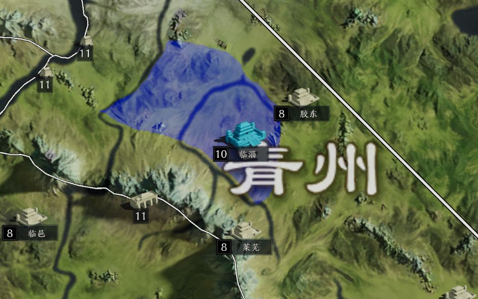 2、同盟占领的城池所在县、自己主城、攻城大营、同盟大营周围都存在一定范围的补给区域(如下图蓝色区域)。