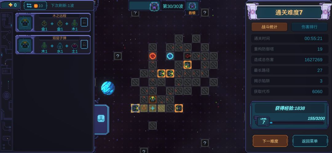 侥幸,这次依靠多加一条命、和增加水土元素的科技,一次性过了难度8。依旧只用了疾射塔,系统等级1