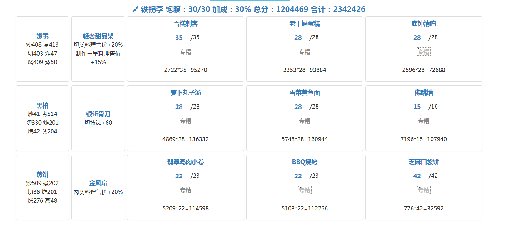 ①需要一定的高分菜专精和菜谱上限(3星上限越多越好,≥3可以稳过),否则可能会差几万到十几万。