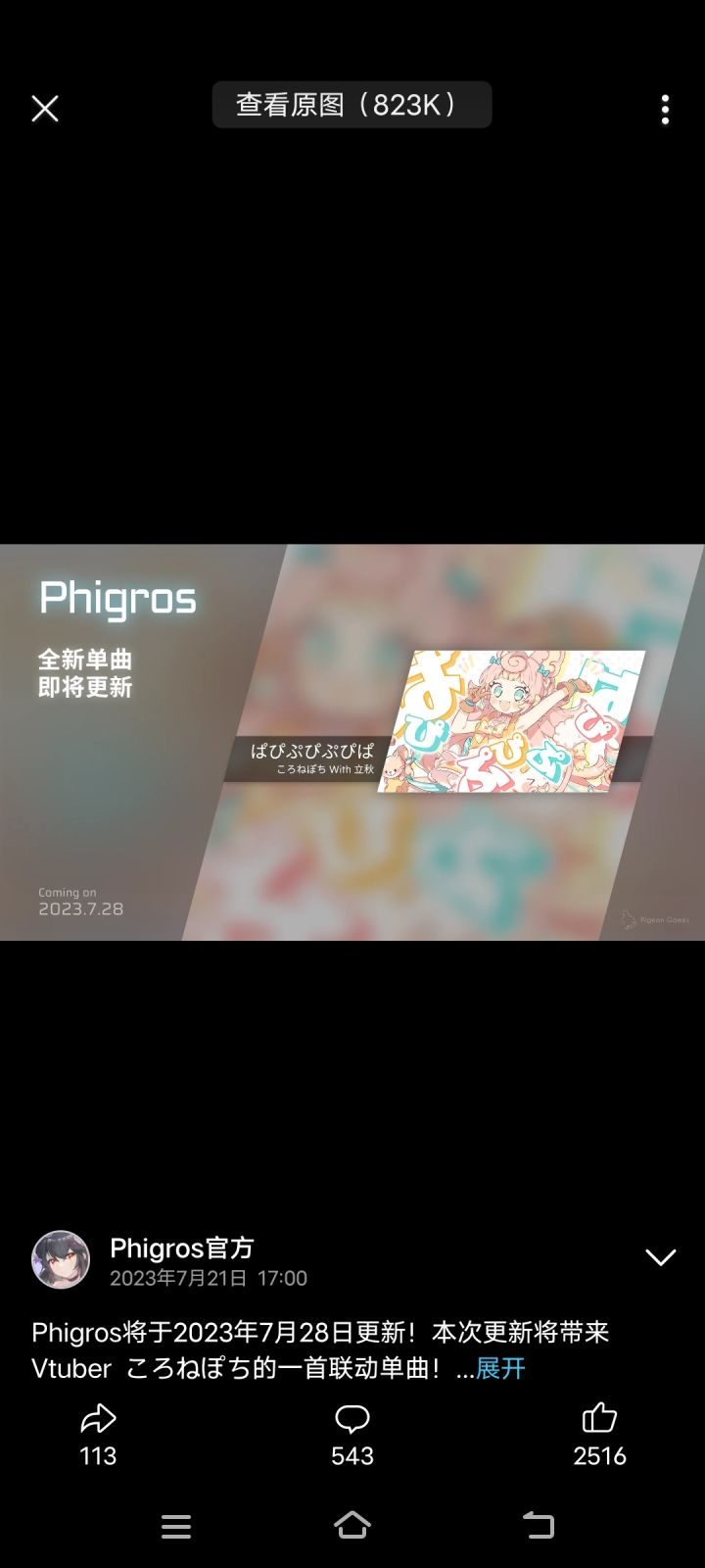 Phigros将于2023年7月28日更新!本次更新将带来Vtuber ころねぽち的一首联动单曲!