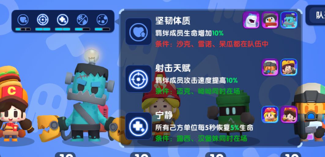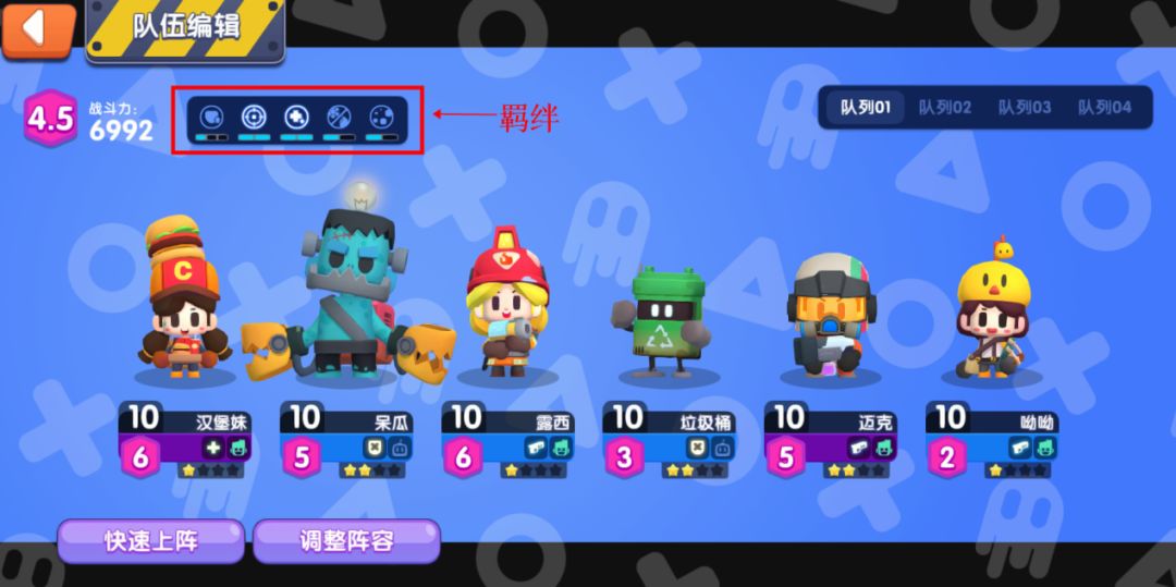 欢迎来到幸存者队伍编辑界面,在这里大家可以依照自己的策略进行组队,有一些特定的搭配组合,可以激活【羁绊系统】,使战斗更加轻松噢~