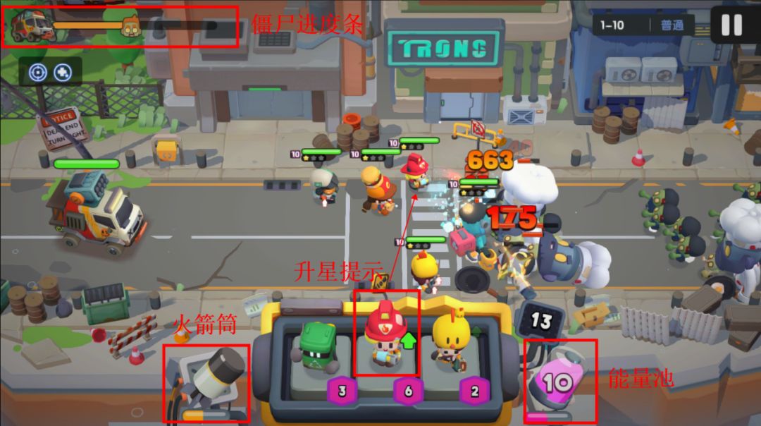 左上角示意着本关卡即将登场的僵尸余量,而画面中带血条的汽车就是我们要努力守护的【资源收集车】,一旦它被破坏就无法回到幸存者小镇继续建设了,坚持到僵尸消失就胜利啦!